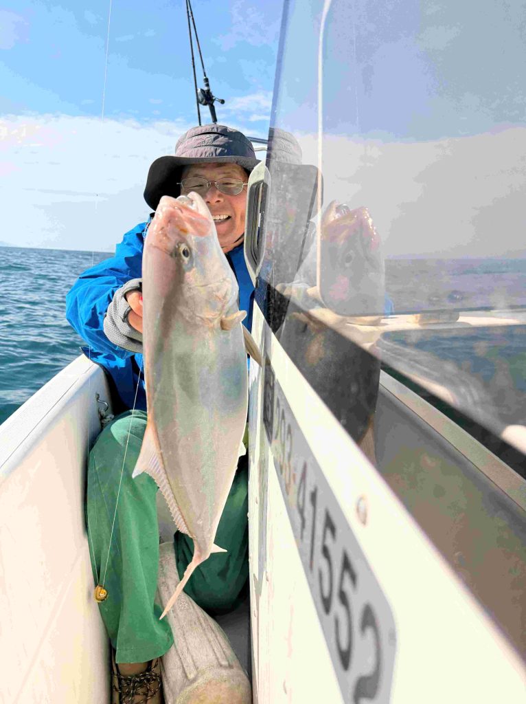 さぁ~あとは何処で釣るかだが、あいにく今日は北東からの風が強く三百曽根は断念し黒島の風裏に入る事にした。 最初は穏やかだったが、東向きの風が強くなり更に野釜島の風裏に入る事になった。 ココはひと月前に青物でフィーバーしたポイントだが以前の「ない」状態に戻っていた。 それでも数少ない反応から突破口を開いてくれたのはレオ君だ!