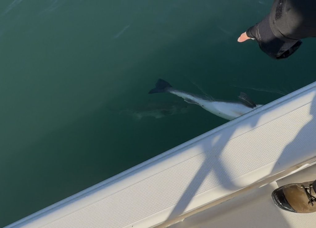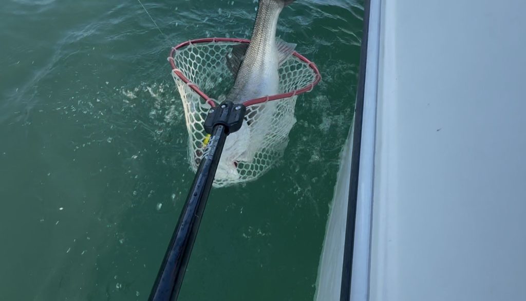左舷側で山下さんが蘇生しているシーバスの下に、よく見ると山下さんが掛けたシーバスが見える、左舷でランディングしよう、、、