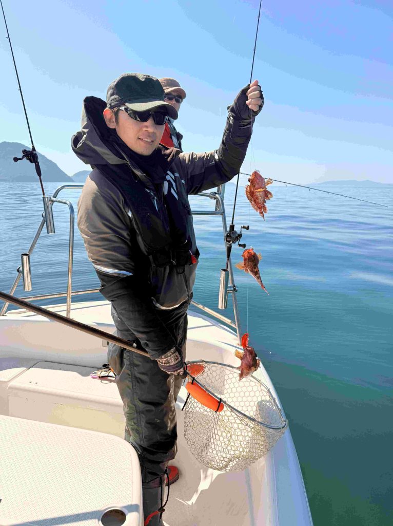 山本さんがタイラバのサビキ仕掛けのすべての針で3匹掛けを達成。 途中ミズイカを見たりしてこれはこれで楽しい釣りになった。